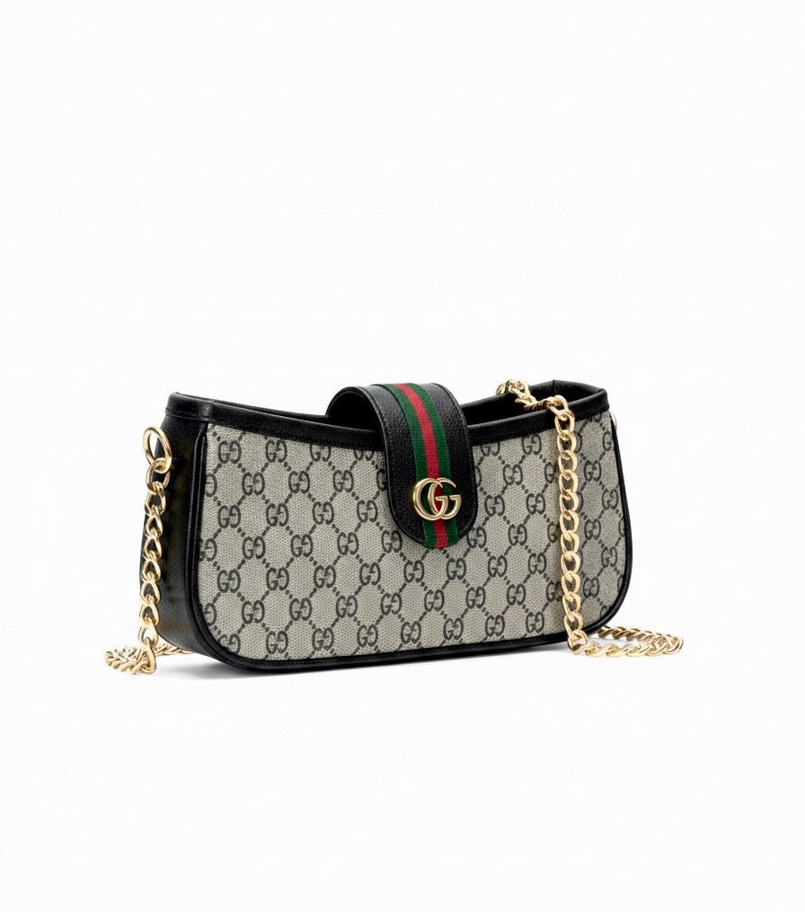 Gucci GG Canvas Beige & Black Monogram Shoulder Bag – Gold Chain